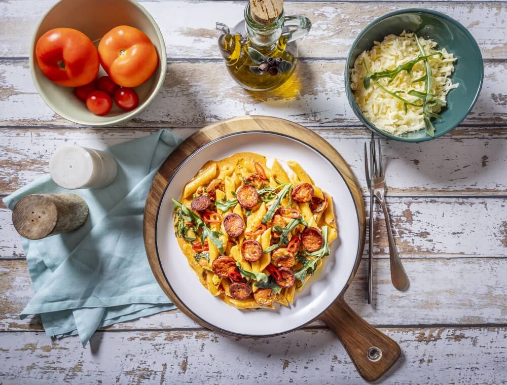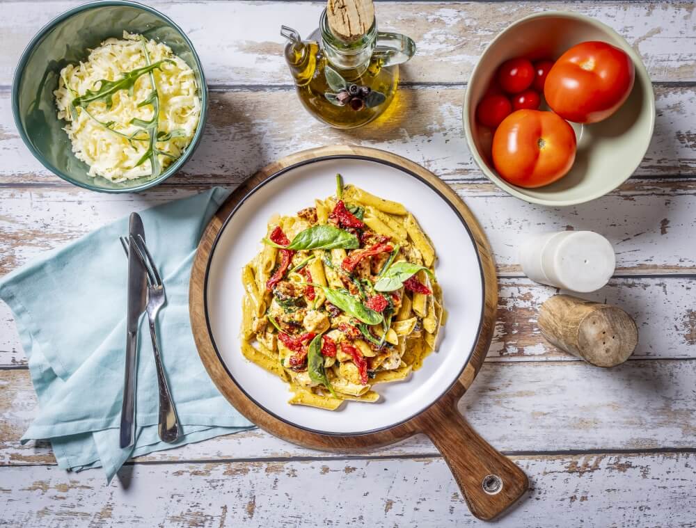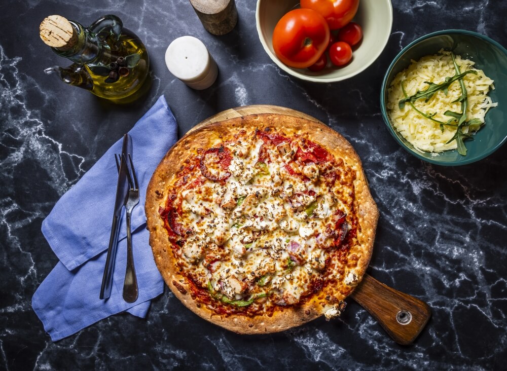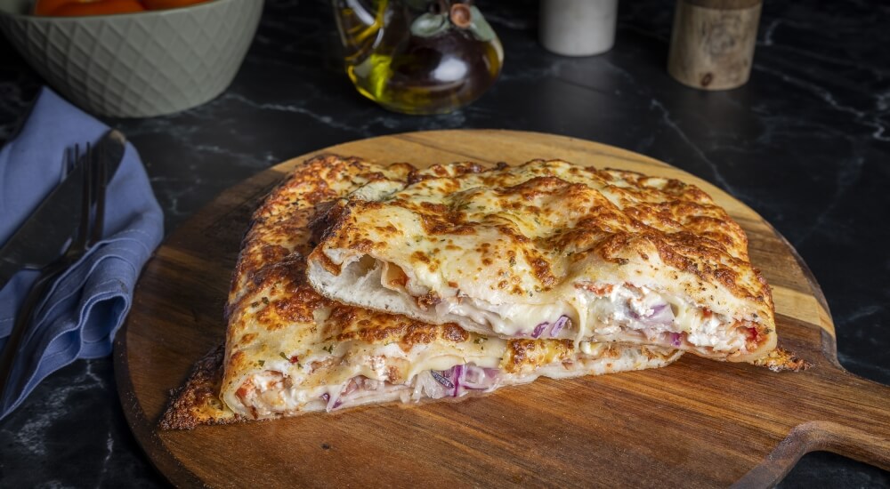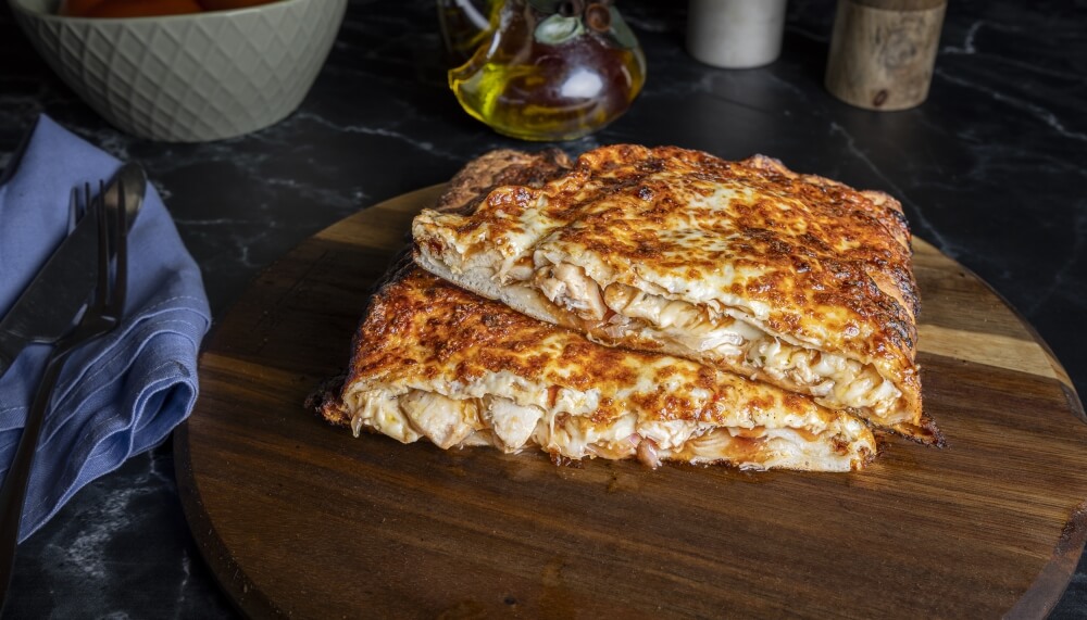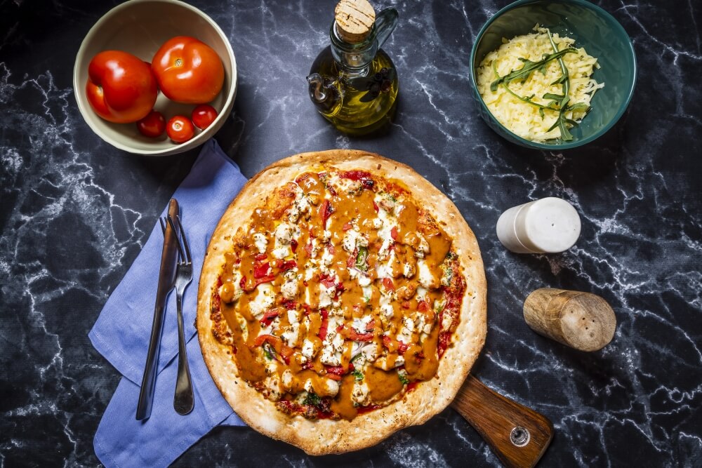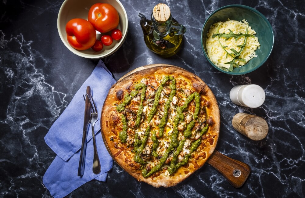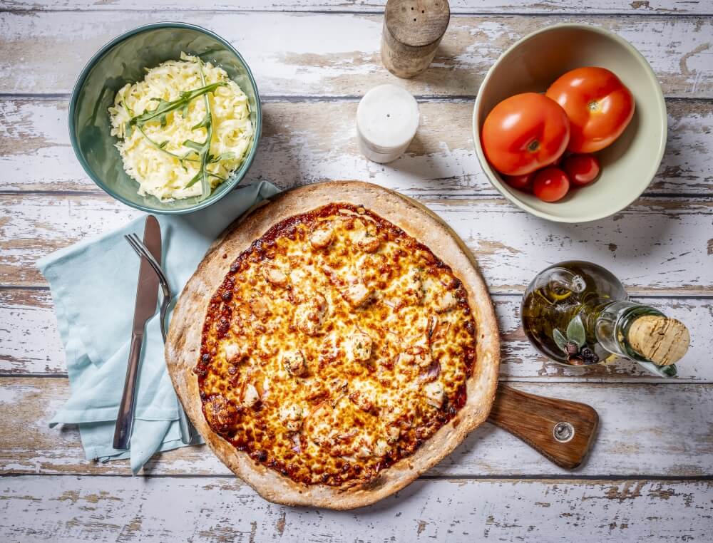 Wild rocket, roast capsicum, fresh tomato, danish feta, chicken on a pesto base with aioli pesto sauce