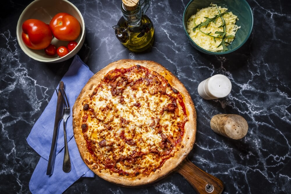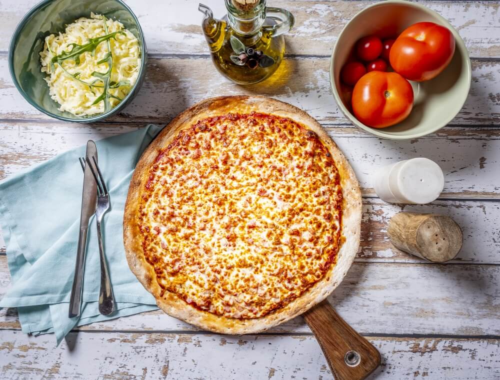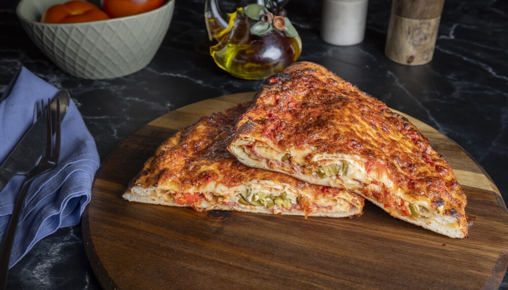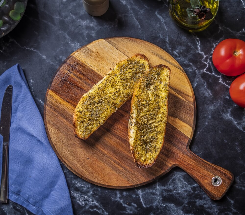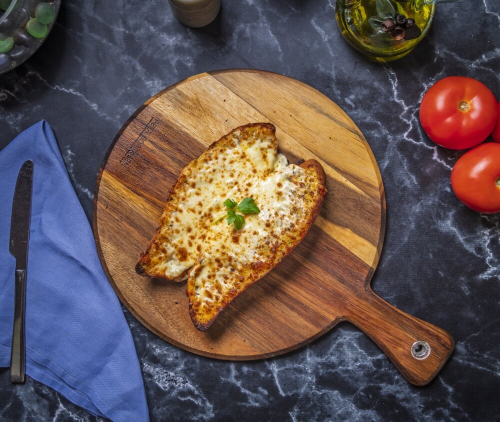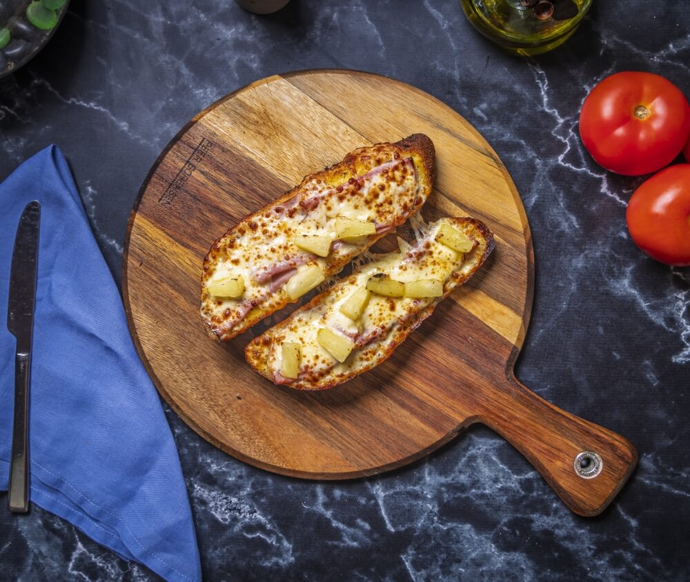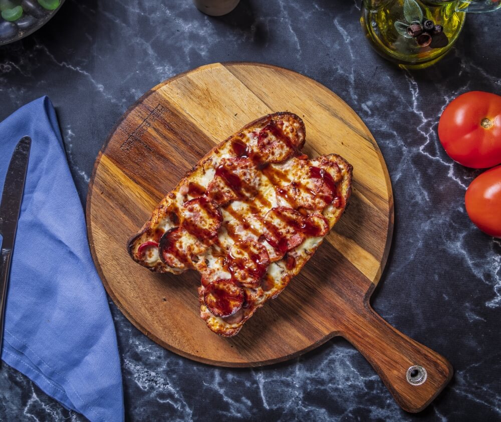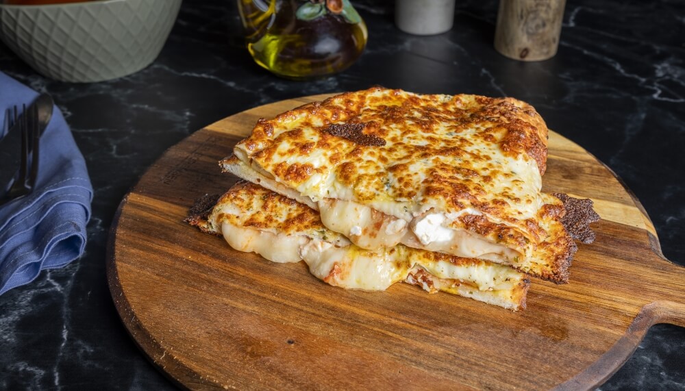 Ham, Onion, Bacon, Fresh Tomato, Mozzarella, Feta, Tomato Base, topped with Garlic Butter