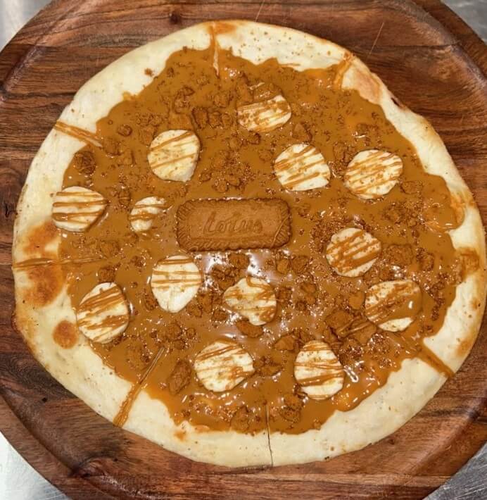 Biscoff Sauce base, with crushed Biscoff Lotus Biscuits, Banana and drizzled with Biscoff Caramel!