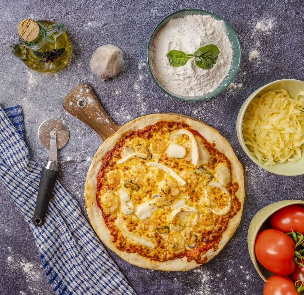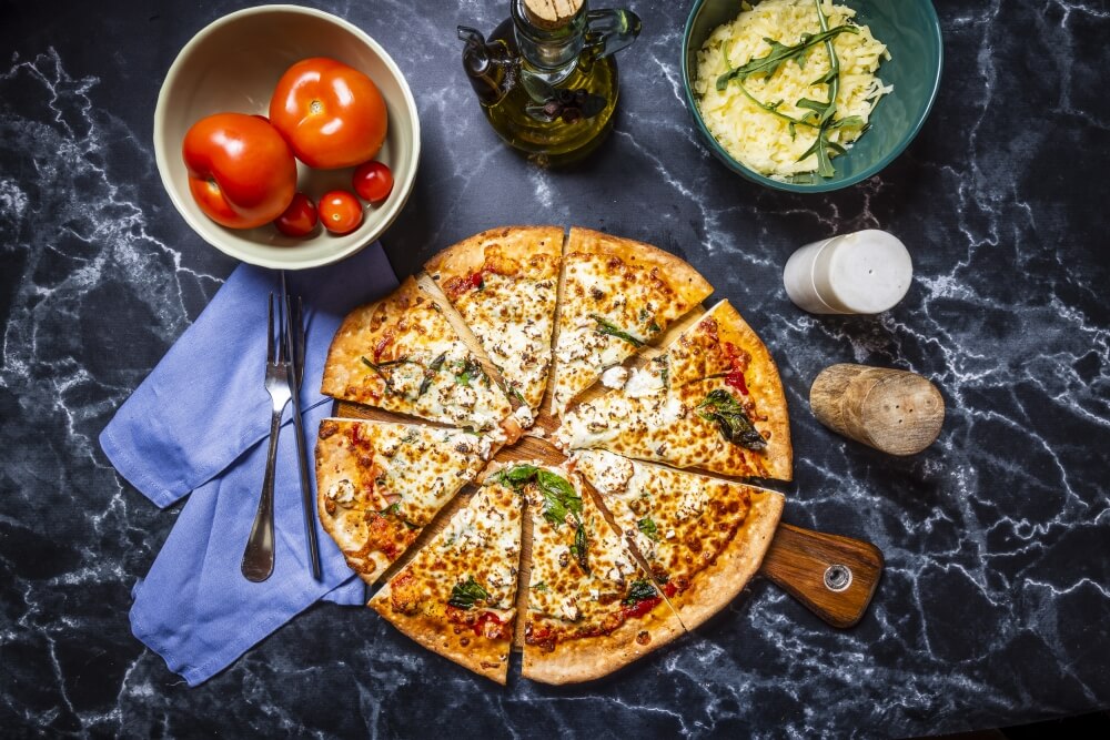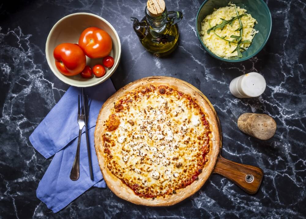 Tomato Base, Provolone, Feta, Mozzarella & Parmesan Cheese, Crushed Garlic