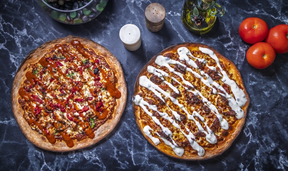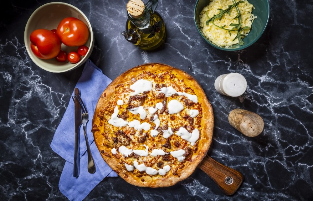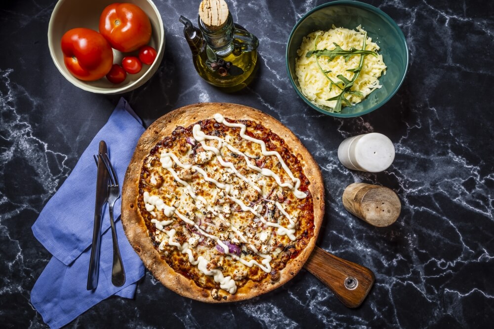 BBQ base, chicken, caramelised onion, mushroom, bacon, feta and aioli sauce