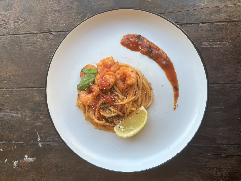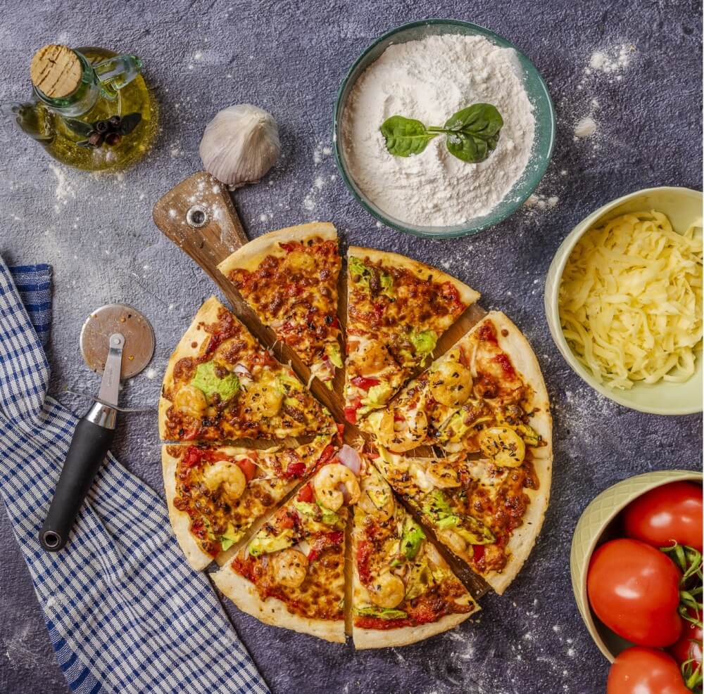 Roasted capsicum, spanish onion, garlic marinated prawns, avocado topped with fresh chilli.