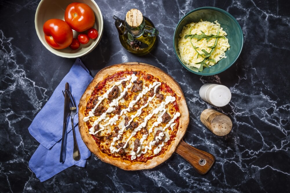 Lamb, roasted potato, cracked pepper, caramelised onions, mozzarella cheese with tzatziki sauce
