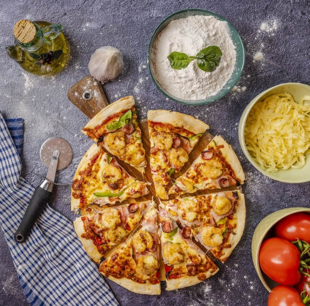 Ham, cabanosi, capsicum and marinated garlic prawns.