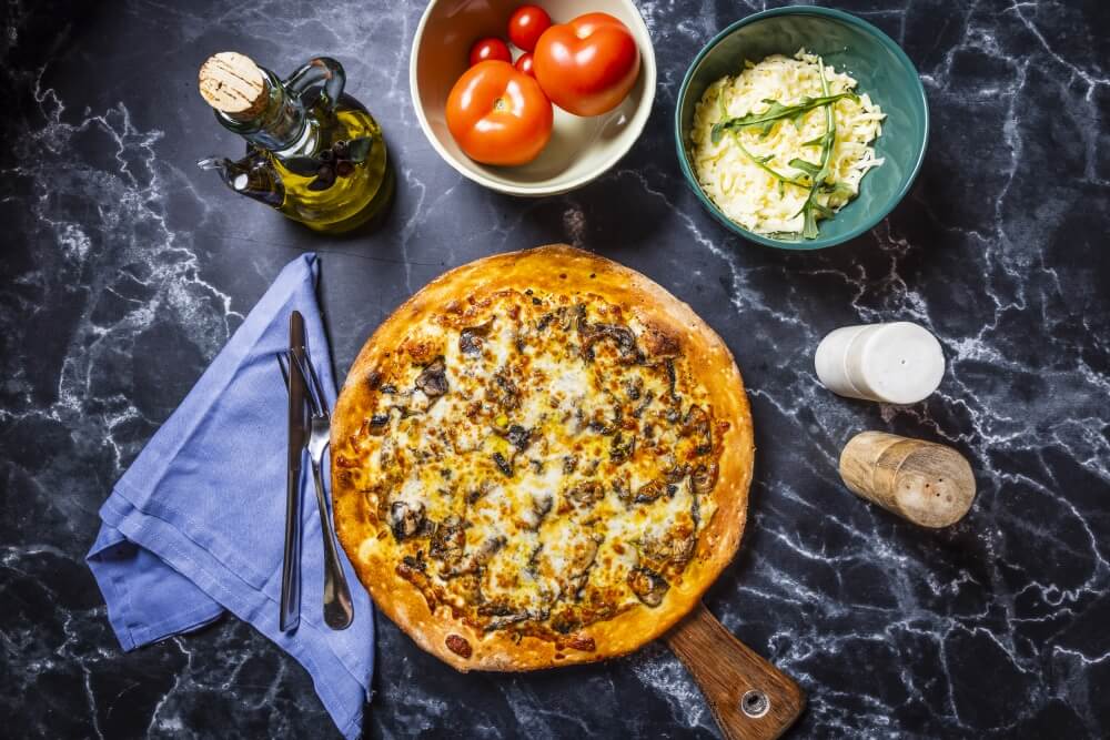 Seasoned mushrooms, provolone mozzarella, roasted garlic, drizzled with imported white truffle oil on a bianca base
